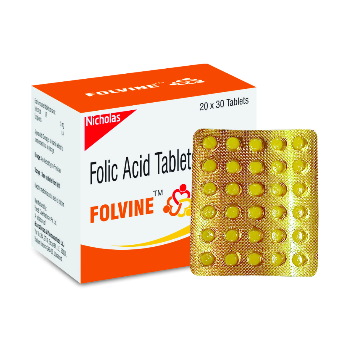 Folvine Tablet is a folic acid supplement. It is used to treat a type of anemia where you have too few red blood cells because you have too little folic acid in your body. Folic acid is needed to produce the red blood cells that carry oxygen around your body.
