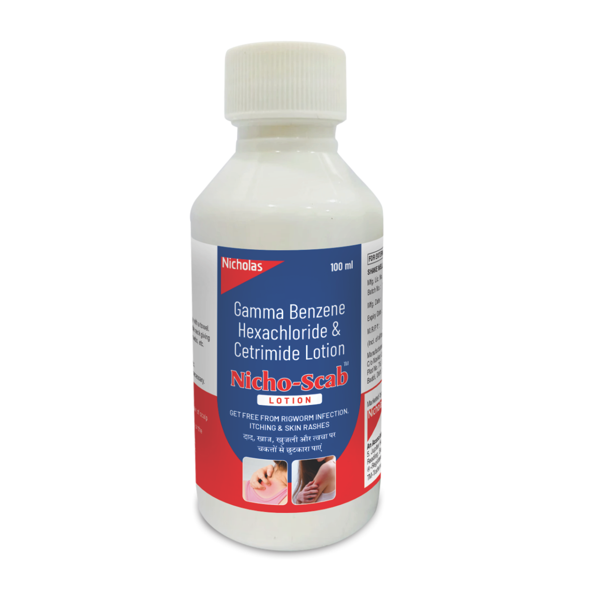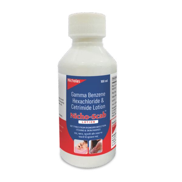 Nicho-Scab lotion is a combination formulation containing Gamma Benzene Hexachloride and Cetirimide. It is used in the treatment of scabies and pediculosis.