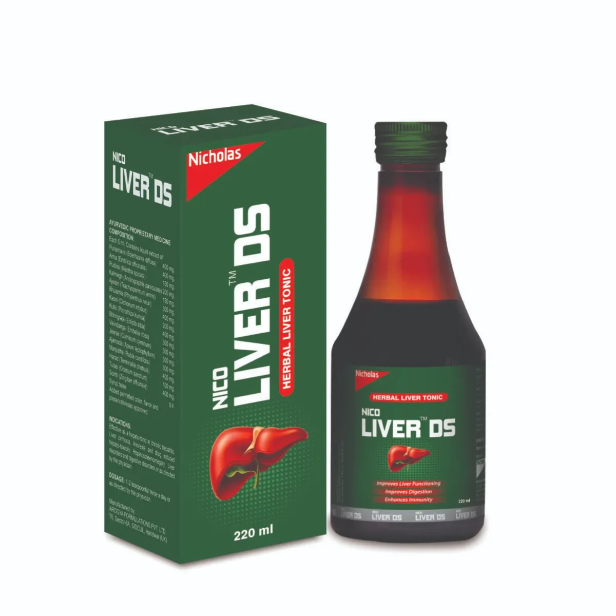 Nico Liver DS syrup is effective as a hepato-tonic in chronic hepatitis, Liver cirrhosis, Anorexia and drug induced hepato-toxicity, Hepatosplenomegaly, Liver disorders and digestive disorders. It is used to Improve liver functioning, aids digestion and enhances immunity.