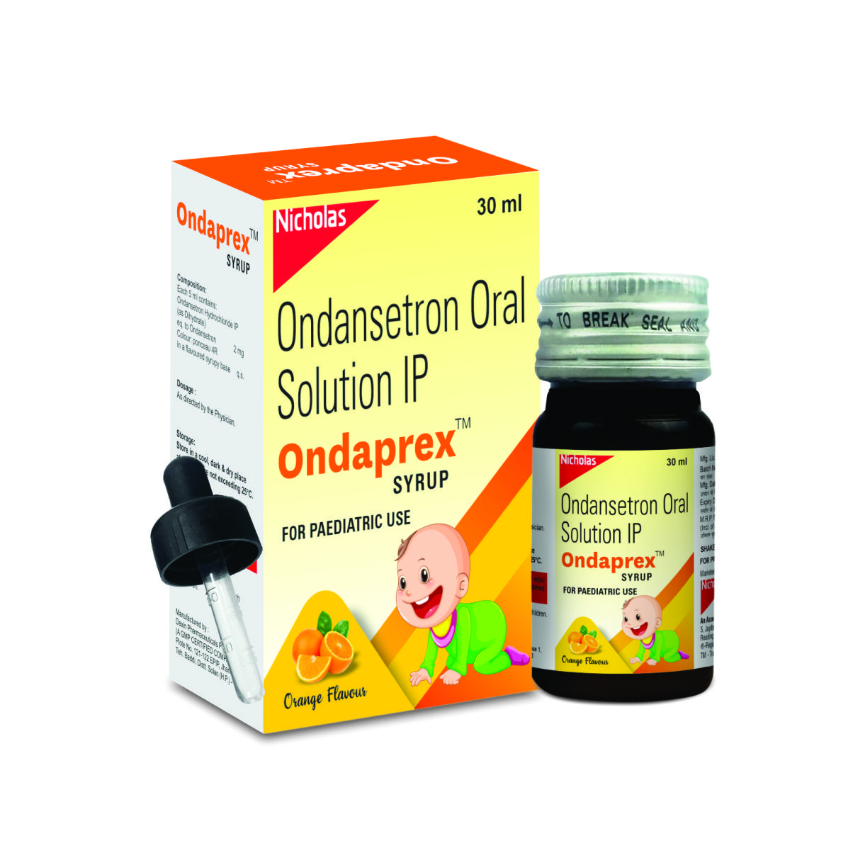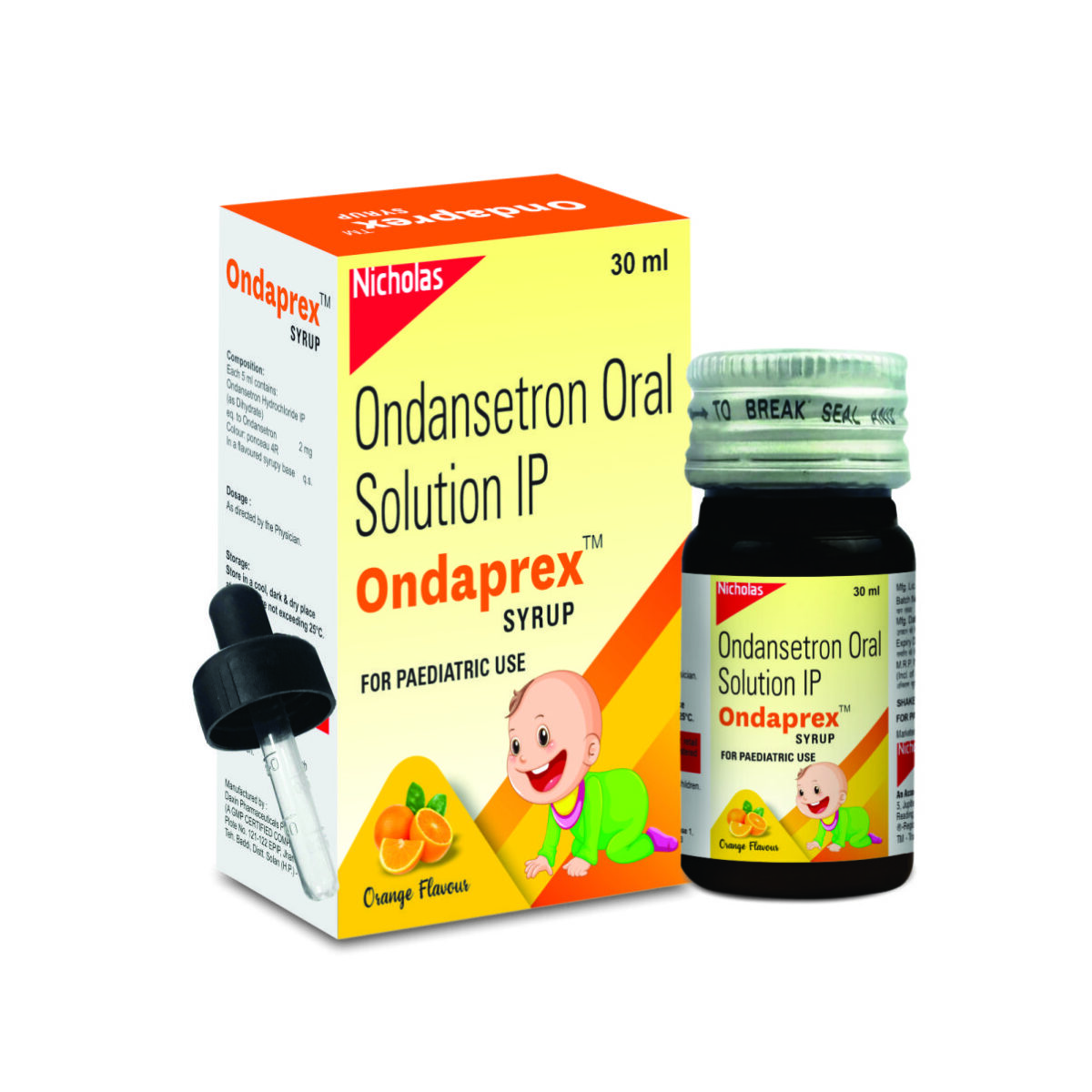 Ondaprex suspension contains Ondansetron 2mg per 5ml in a 30ml oral suspension with a child-friendly orange flavor. It is formulated for children, making administration easy and accurate with the provided dropper. It helps reduce vomiting and nausea in pediatric patients.