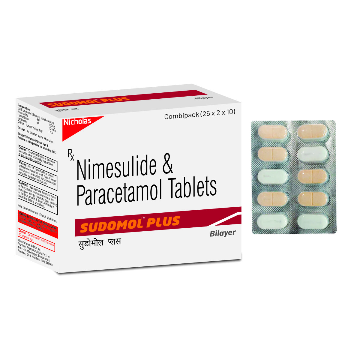 Sudomol Plus tablet is a combination medicine containing Nimesulide and Paracetamol. It is used in relieving pain and inflammation in conditions like rheumatoid arthritis, ankylosing spondylitis, and osteoarthritis. It is also used to relieve fever, muscle pain, back pain, toothache, or pain in the ear and throat.