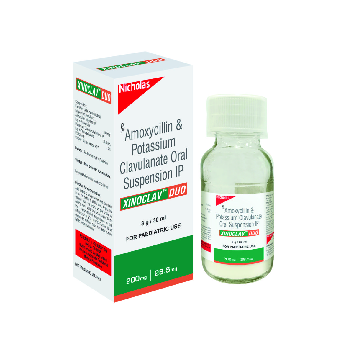 Xinoclav DUO dry syrup is a broad spectrum antibiotic containing amoxycillin 200mg and clavulanic acid 28.5mg. It is used to treat a wide range of bacterial infections, including those caused by resistant bacteria. It is commonly prescribed for children.