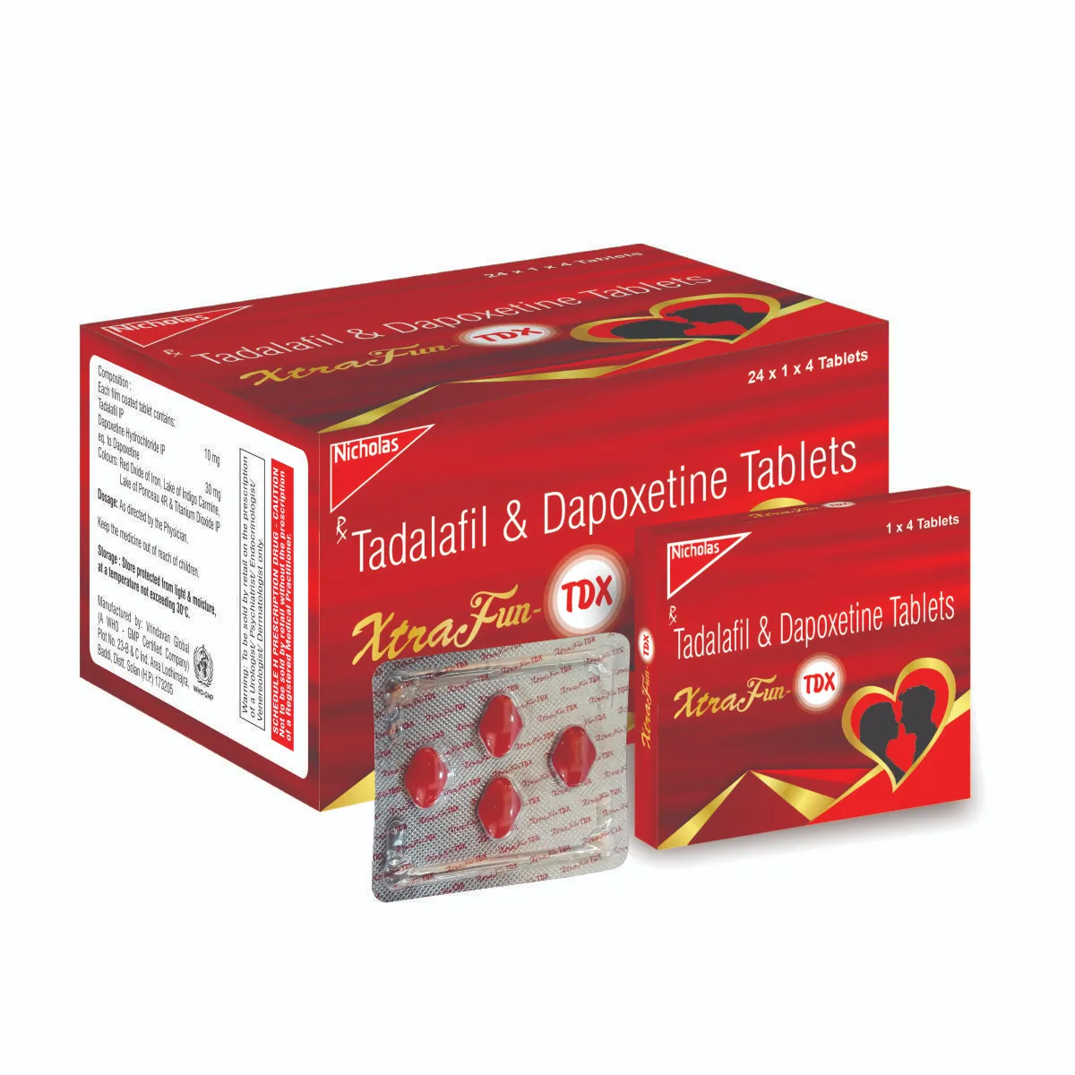 Xtrafun TDX tablet is a combination medicine containing Tadalafil 50mg and Dapoxetine 30mg. It is a prescription based medicine used to treat the errectile dysfunction in men. The tablet is available in red colored diamond shape.